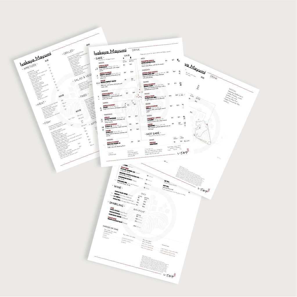 Designed a food and drink menu for a Japanese izakaya in San Francisco’s Inner Richmond neighborhood.